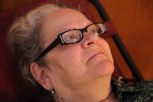 Lying on a fold-out chair in a darkened room with several other people, Keene has about a dozen acupuncture needles in place.