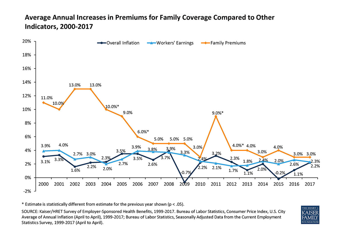 The average total cost of family premiums was $18,764 for 2017, according to a by the Kaiser Family Foundation and the Health Research & Educational Trust. That cost is generally divided between the employer and workers. (Kaiser Health News is an editorially independent program of the foundation.)