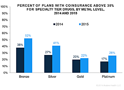 In ¡°silver¡± level plans, the most commonly purchased exchange plans, 41 percent will require payments of 30 percent or more for specialty drugs, up from 27 percent in 2014.