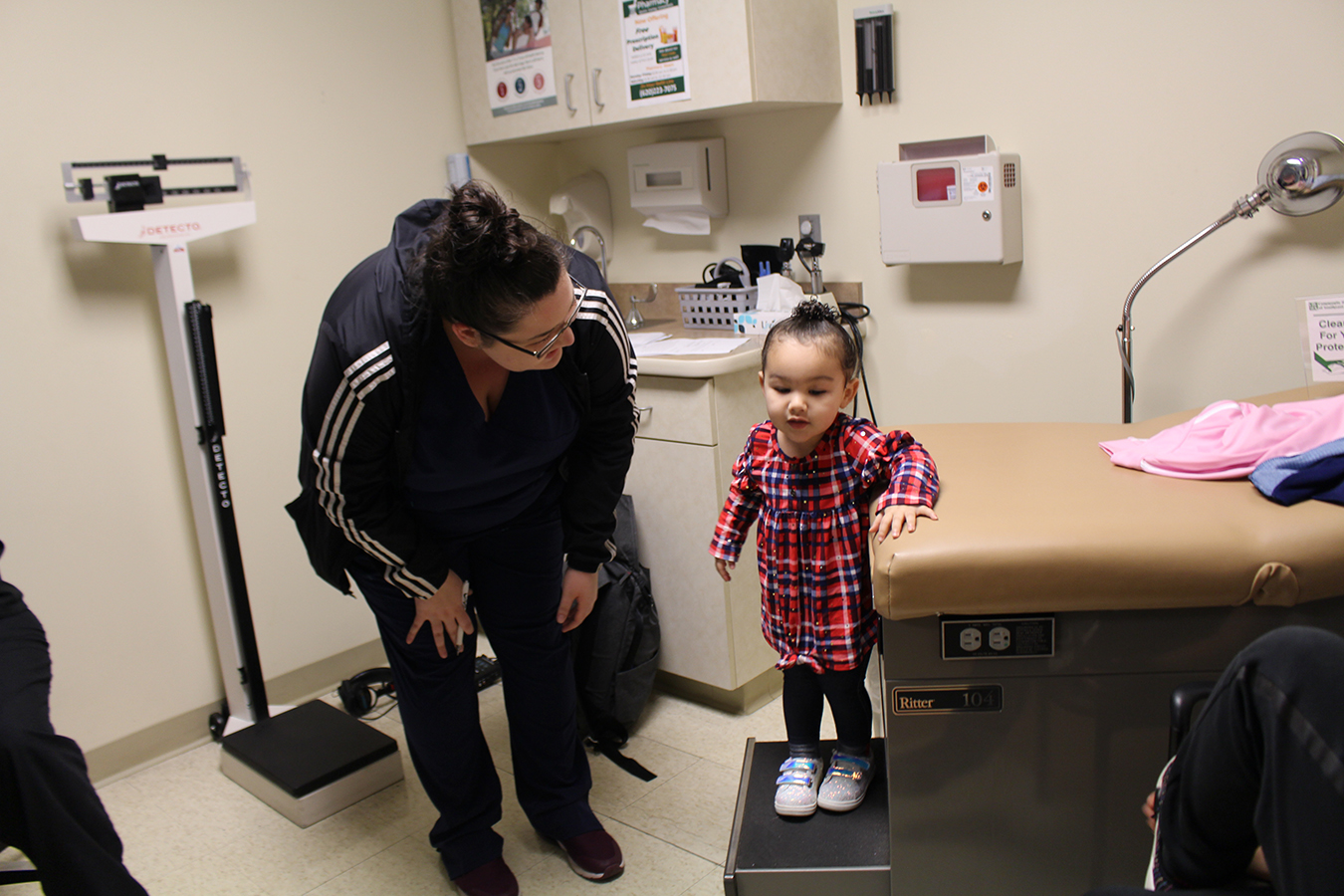 Two-year-old Taelyn’s brown eyes grow round and her tiny hand reaches out. But, first, Self makes sure she opens her mouth wide and he peers down. Behind him sits another staff member ― a medical scribe. Self’s scribe gives him the ability to “focus on people,” rather than toggling between a computer screen and the patient. It’s a new perk he didn’t have when he worked at Mercy Hospital.