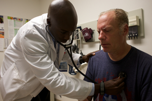 Student Ngabo Nzigira is in his sixth week of medical school and hes already interacting with patients, as he trains under the guidance of a doctor at Kaiser Permanente in Sacramento. (KHN is not affliated with Kaiser Permanente).