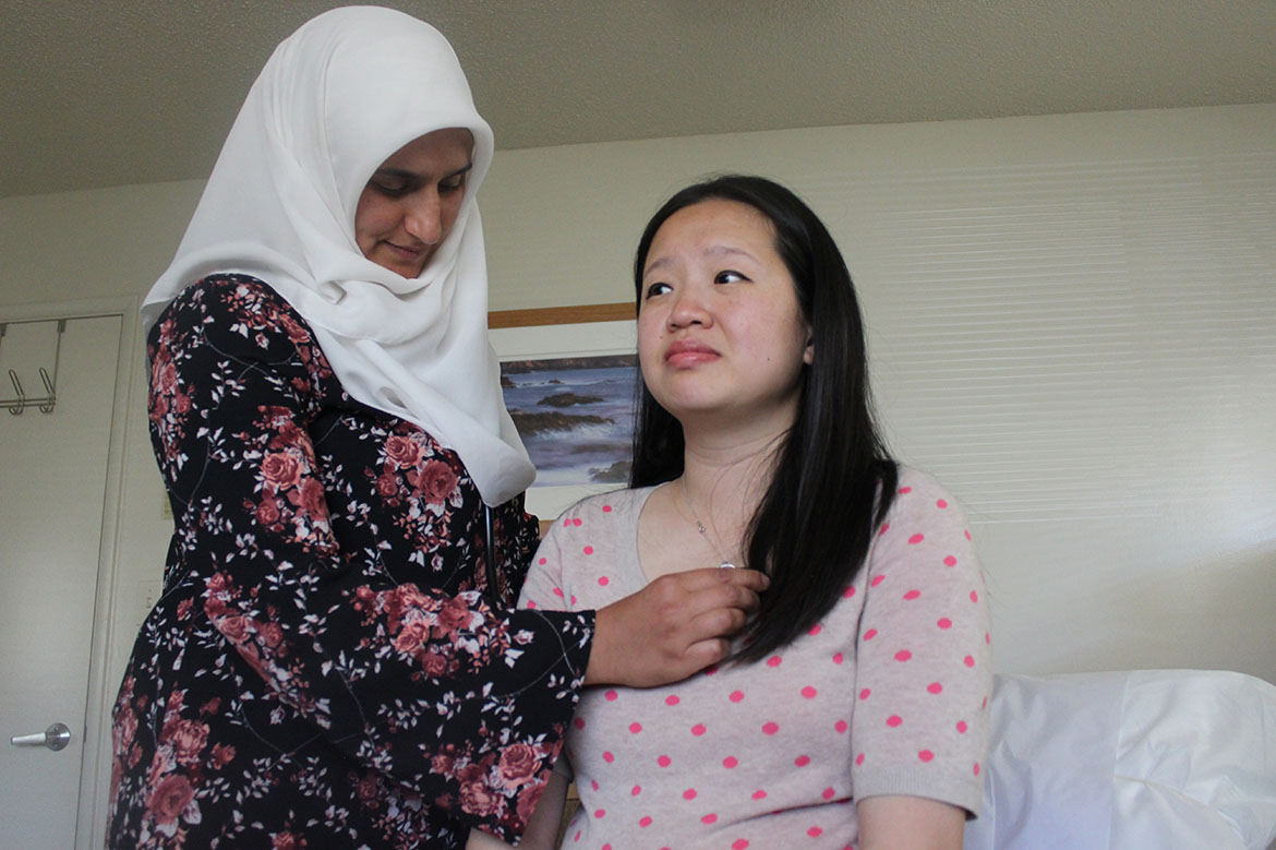 On a sunny day this spring, Azad walked into her patient’s room wearing a colorful headscarf. Just weeks from her due date, Ruby Lin sat on the end of the exam table holding her belly. The two women greeted each other like old friends.