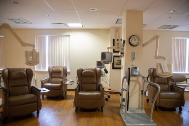The center, with its muted natural grays and browns, had windows overlooking the front parking lot and forested land beyond. Every patient could look out the windows or watch their personal television terminal, and each treatment chair had plenty of space for family members to pull up chairs.