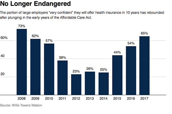 This year, 65 percent expected to offer health benefits in a decade. And 92 percent said they were very confident a company-based health plan would exist in five years.