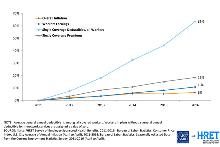 Since 2011, the average deductible for single coverage has soared 63 percent, according to the survey, while workers’ earnings have gone up by only 11 percent.