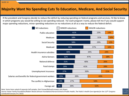 Forty-six percent of those surveyed said they would not accept any reductions to Medicaid, the federal-state insurance program for the poor which has been a big target of Republican lawmakers. Those percentages are largely unchanged from two years ago, “suggesting the past year of debate over the need to make cuts had not greatly altered the general shape of public opinion,” the survey found.