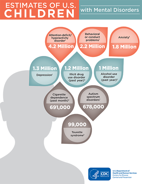 The CDC put together this handy infographic to chart the prevalence of various illnesses. ADHD is the most common diagnosis, followed by behavioral and conduct problems.