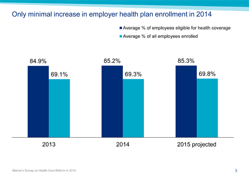 “What was most surprising was that we did not see much growth in [employer plan] enrollment,” said Beth Umland, director of research for health and benefits at Mercer. “It may just be pushed off until 2015, or employers are finding ways to have a soft landing around enrollment growth.”
