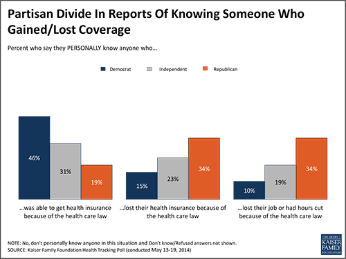 About 3 in 10 Americans say they know someone who was able to get health insurance because of the health law, while 23 percent reported they knew someone who lost their job and 19 percent knew someone who had work hours cut due to the law. Those saying they know someone who gained coverage are more likely to be Democrats (46 percent versus 19 percent). Republicans reported knowing someone who lost coverage or had a job-related impact more often than Democrats (34 percent versus 15 percent).
