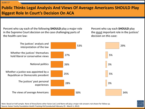 The poll found a good deal of skepticism that the court’s ruling will be made purely on a legal basis. Only 54 percent think the justices’ analysis and interpretation of the law will play a major role in their decision. Half of Americans believe the justice’s own ideological views and and national politics will play a major role.