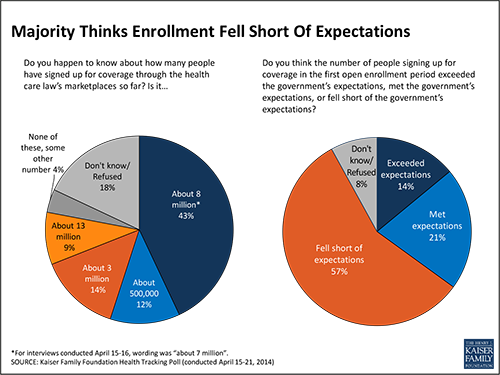 Despite a last-minute surge that boosted health law enrollment beyond initial targets, nearly six in 10 people say the number of individuals signing up for coverage fell well short of expectations. Even among those who correctly identified that , roughly half believe enrollment was lower than expected. And the same share say the law is not working as intended. The poll was conducted from April 15 through 21, and President Barack Obama announced the 8 million enrollment on April 17. But the Kaiser researchers said their analysis indicates no substantive differences in opinion for interviews conducted before and after the announcement.