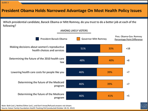 As the race for the White House has tightened, President Barack Obama has seen his advantage on several key health issues narrow significantly among likely voters, according to a Kaiser Family Foundation . (KHN is an editorially independent program of the foundation).