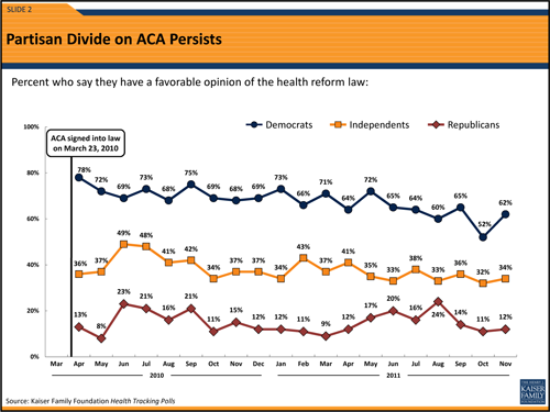 Democrats, whose gloominess about the law was responsible for bringing it down in October, got a bit more positive about the law in November, with 62 percent giving it a thumbs up, a 10 percentage point increase.