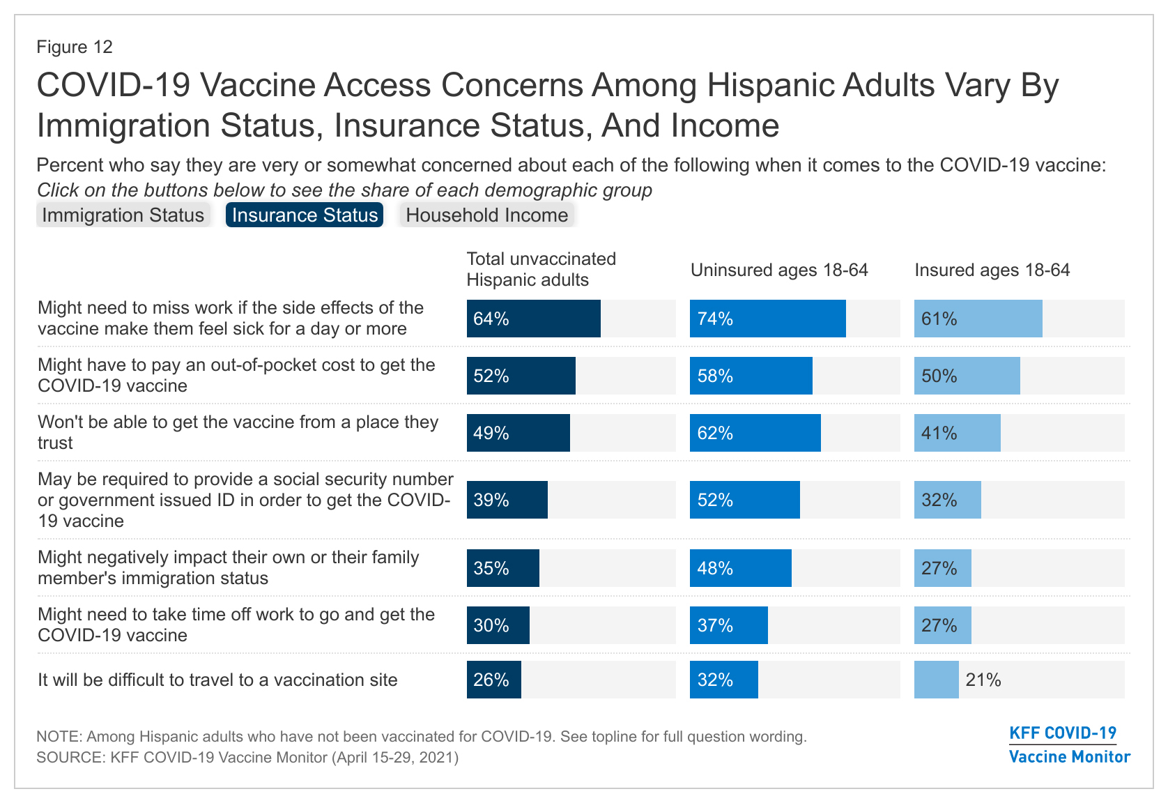 Among unvaccinated Hispanics, 64% were worried about missing work because of vaccine side effects, and 52% were concerned about having to pay for the shots — although the shots are offered at no cost. These numbers are even higher for Hispanics who lacked lawful permanent resident status.