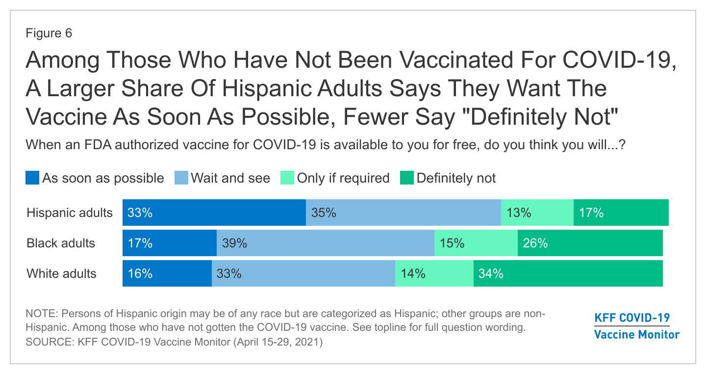 Hispanics who have yet to receive a covid shot are about twice as likely as non-Hispanic whites or Blacks to say they’d like to get vaccinated as soon as possible, according to a survey released Thursday. The findings hint at fixable, though difficult, vaccine access problems for the population.